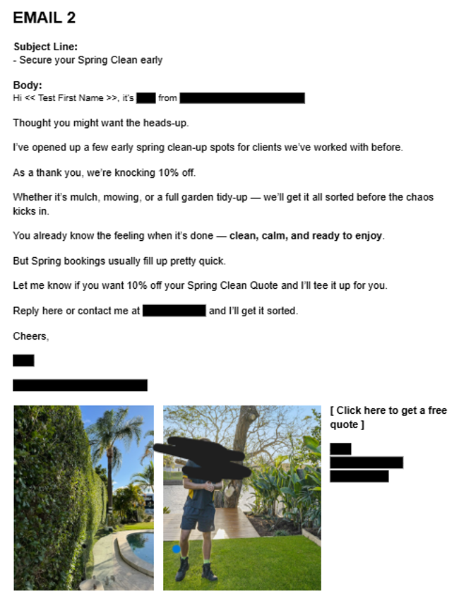 A landscaping company wanted more spring bookings without running ads. We focused on reactivating past customers instead of generating new leads. We used a short reactivation campaign to past customers offering an early booking incentive.